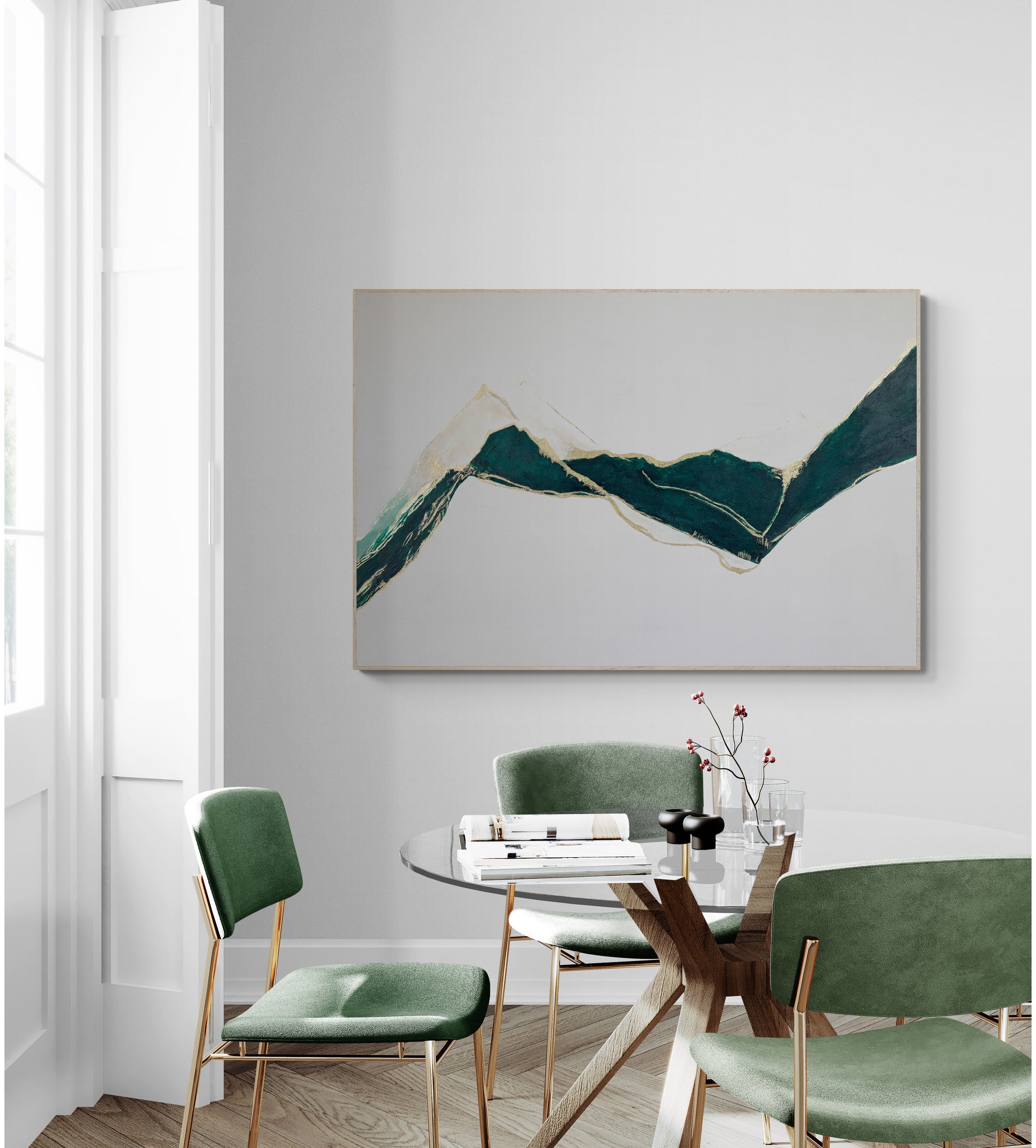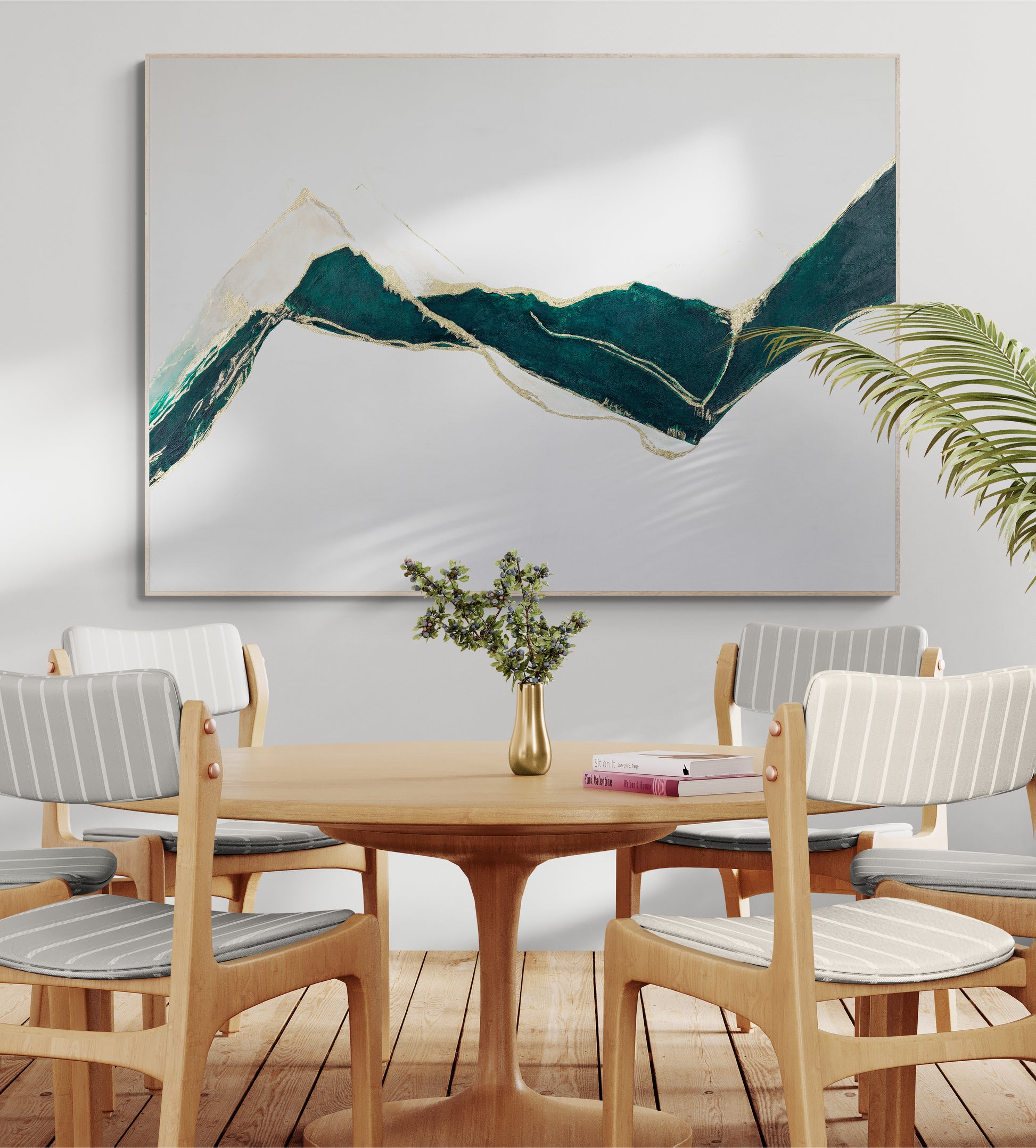 An abstract portrayal of emerald green mountains accented with bold gold lines. This striking piece captures the majesty and elegance of nature’s heights, bringing a sense of strength and luxury to any space.