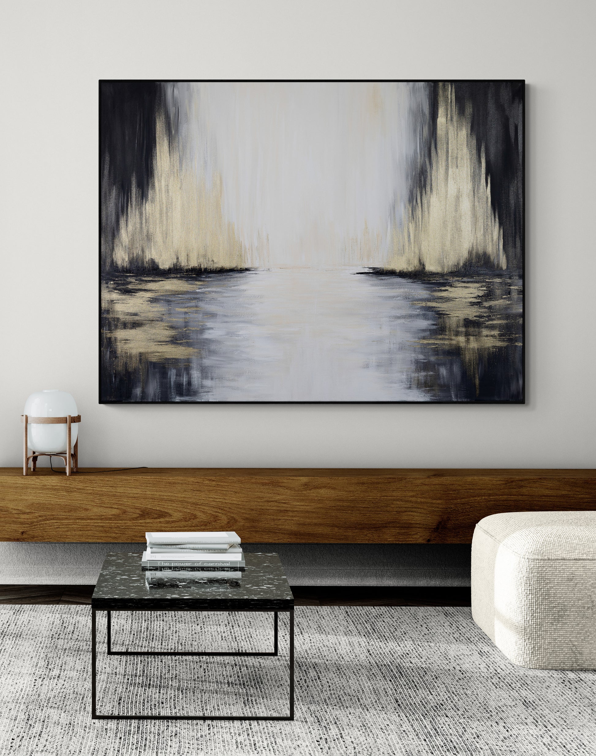 A bold black canvas illuminated by radiant gold reflections, creating a powerful and striking composition. This artwork commands attention, adding dramatic luxury and depth to any modern space.